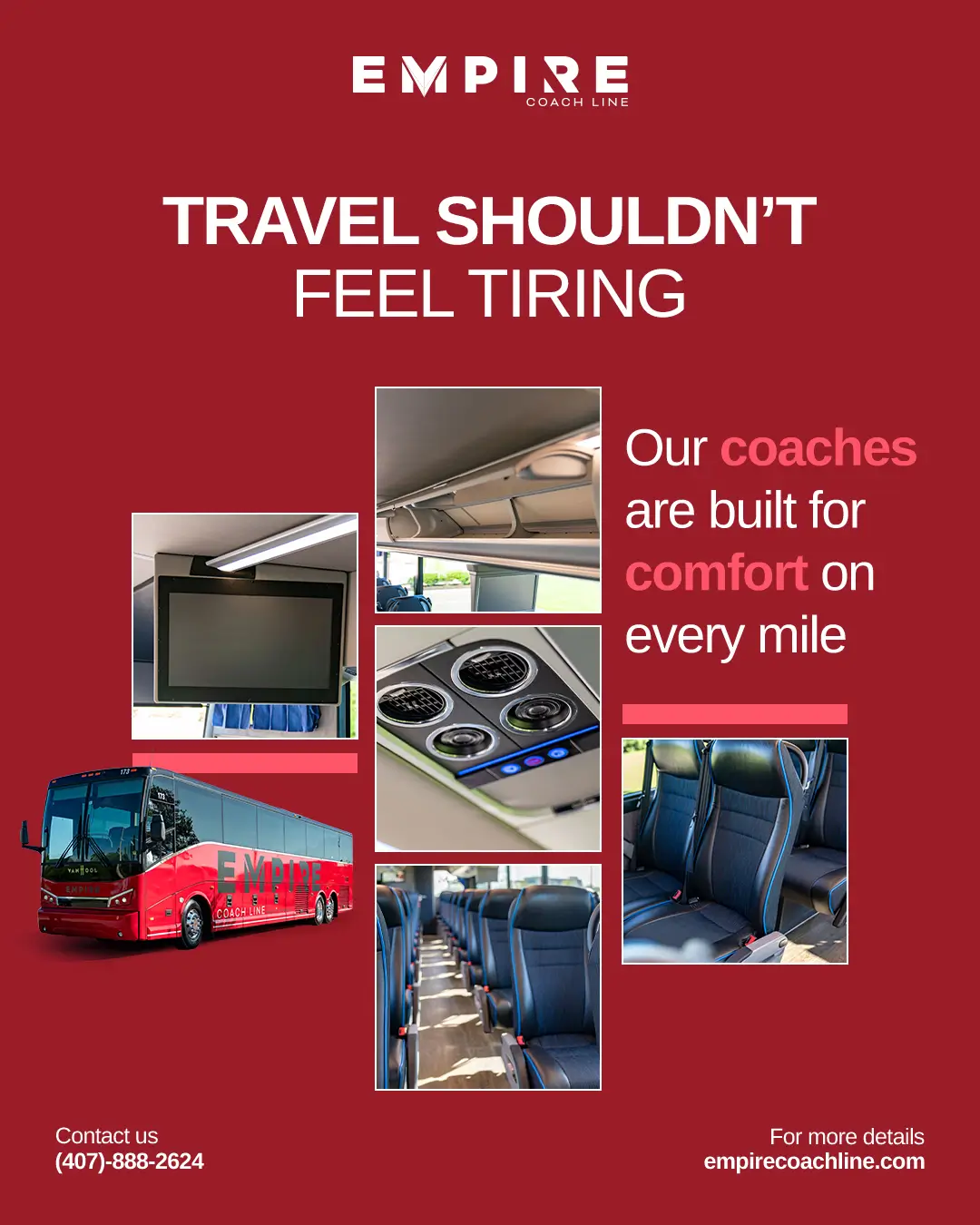 Empire Coach Line operates its own fleet of 56-passenger motorcoaches without any middlemen, or hidden broker markups. Each bus is maintained in-house and equipped with Wi-Fi, power outlets, restrooms, and ADA-accessible features.